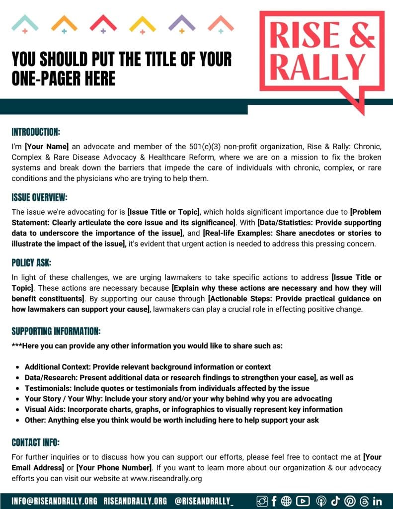 Whether you’re a seasoned advocate or new to the world of advocacy, our template is an easy way to create a one-pager that will help you make a meaningful impact in the fight for chronic, complex and rare disease advocacy and healthcare reform!