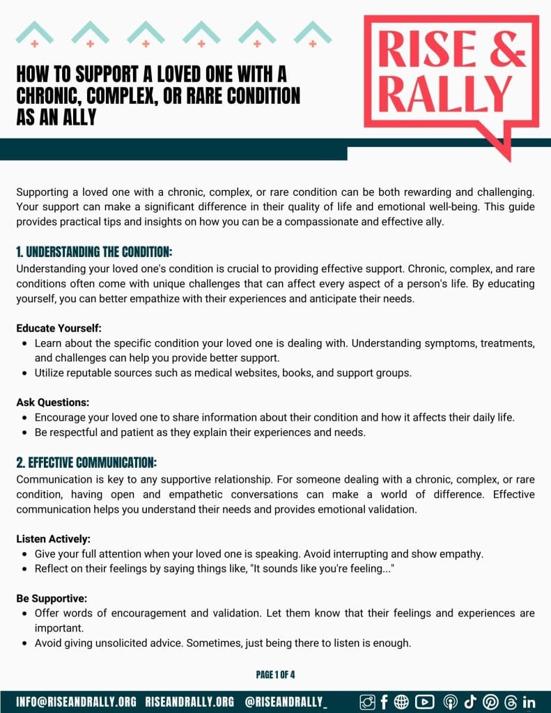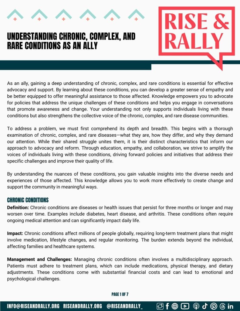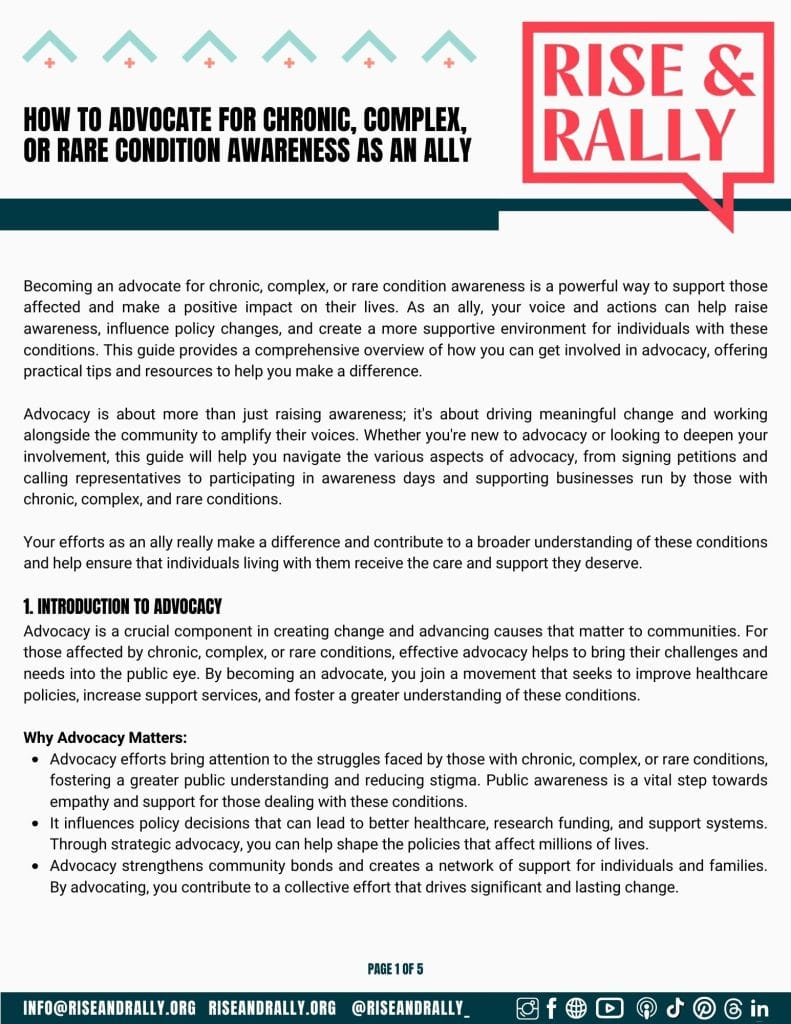 At Rise & Rally, we are committed to empowering allies who support our mission to improve healthcare for those with chronic, complex, and rare conditions. That’s why we have created a variety of free downloadable resources to assist you in your advocacy efforts. These resources cover a wide range of topics, offering education on these conditions, healthcare reform, and ways to effectively support patients. We believe that allies play a crucial role in amplifying the voices of those affected, and we hope these resources help you make a meaningful impact.