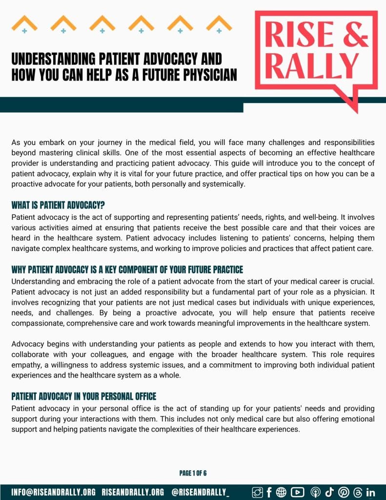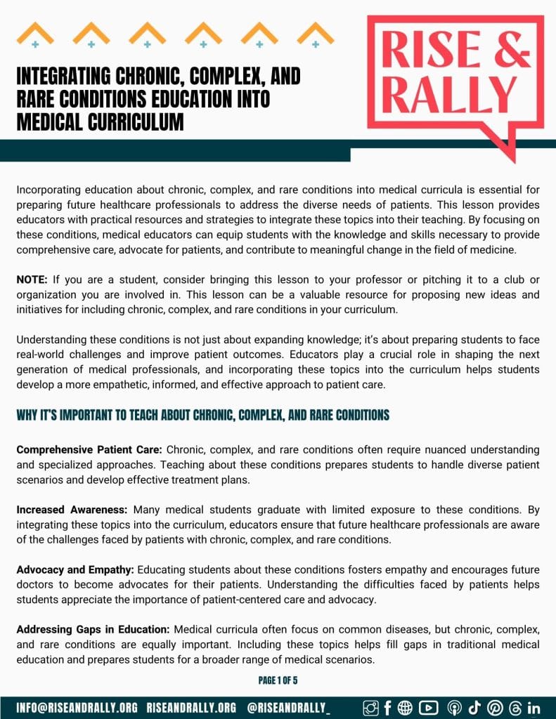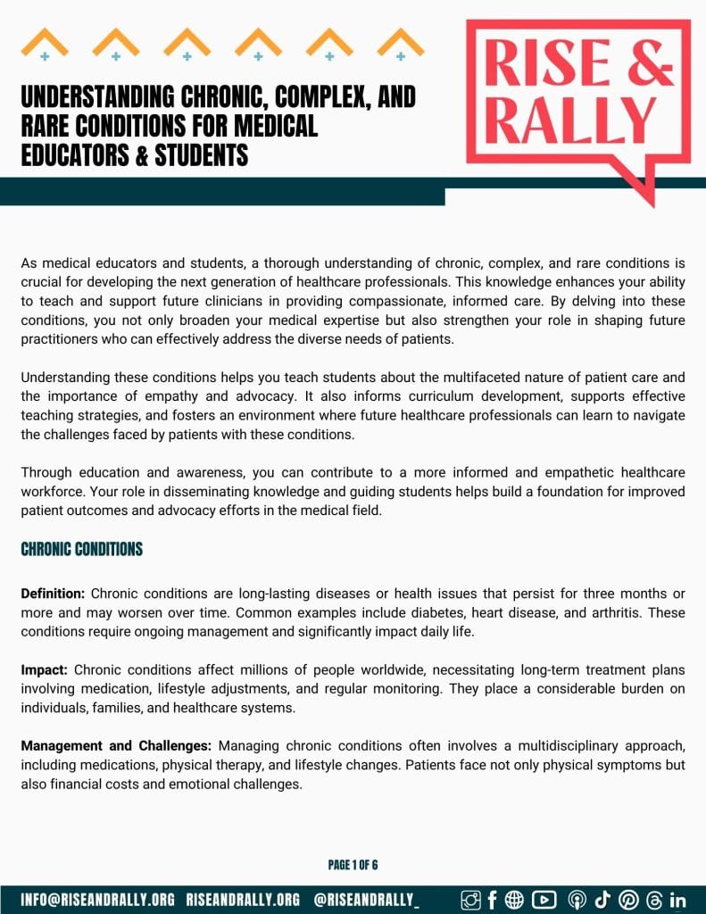 At Rise & Rally, we are committed to providing medical educators and students with valuable information, educational resources, and support. That’s why we have created a variety of free downloadable resources to support you on your journey as a medical educator educating your students or a student who is trying to learn themselves. These resources cover a wide range of topics and are designed to offer education on these conditions/healthcare reform, insight into the patient experience and resources to help you implement what you have learned. We hope that these will help support you on your journey!