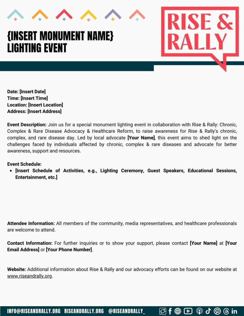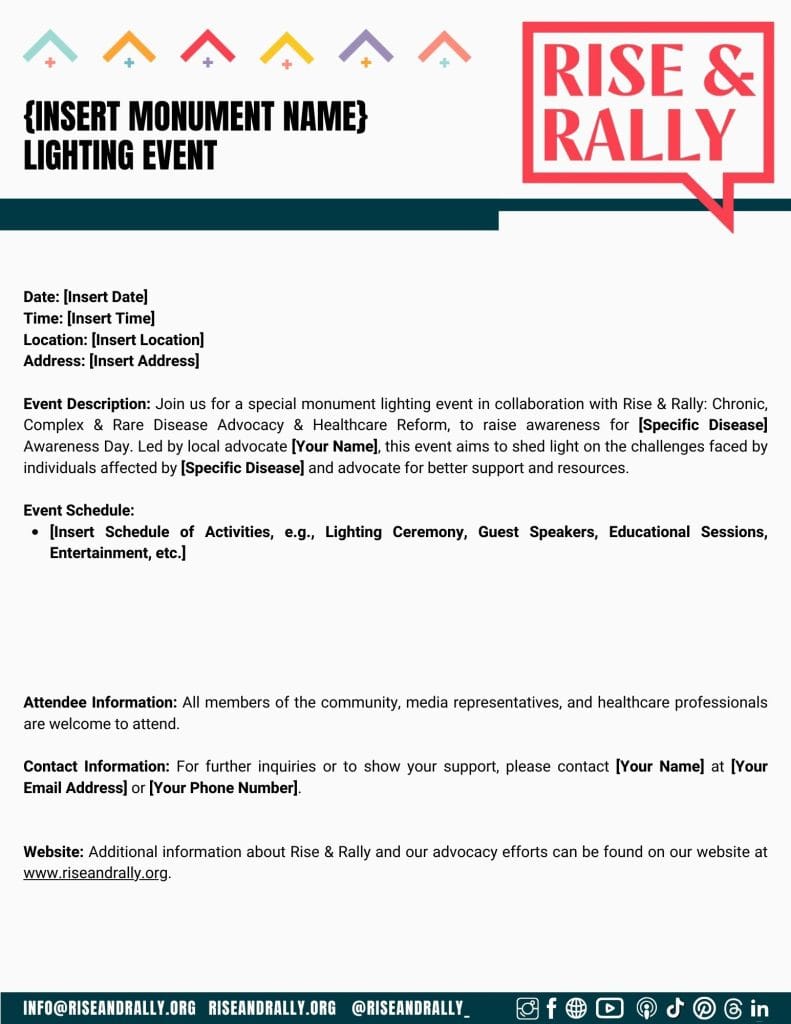 Below you will find a variety of pre-made and easily downloadable templates you can use to help you with your lighting, event and press release requests. These were all made and are editable in canva. If you have not used canva before it is free and simple to use just head over to canva.com and create a free account to get started. If you need help with this please contact us via our contact page and we will help you out! Whether you’re a seasoned advocate or new to the world of advocacy, our templates will help you make a meaningful impact in the fight for chronic, complex and rare disease advocacy and healthcare reform!