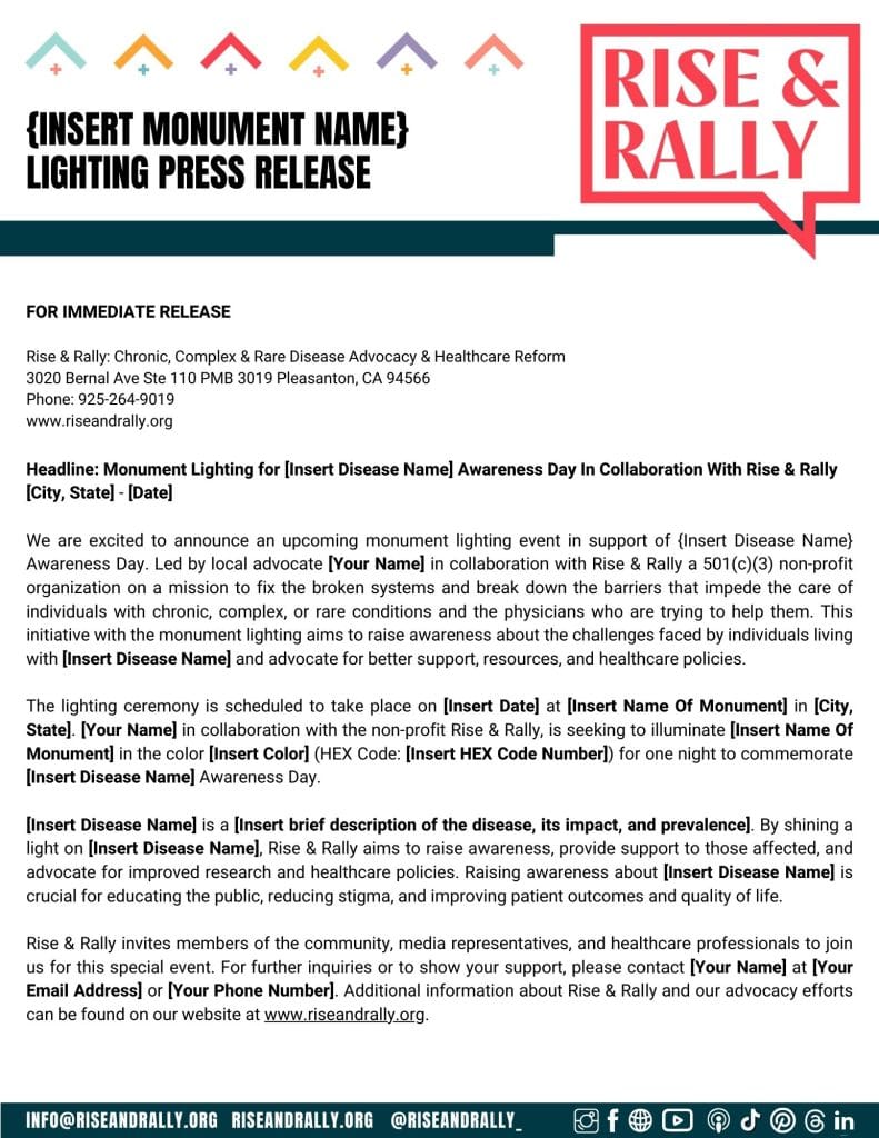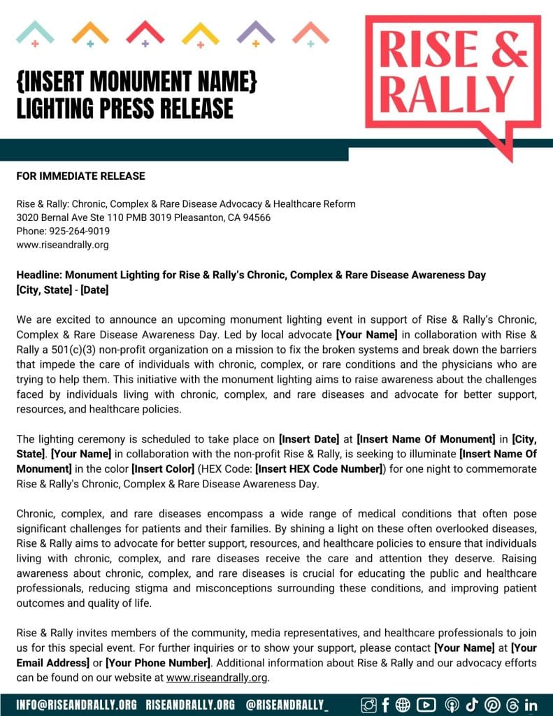 Press Release For A Lighting For Rise & Rally’s Chronic, Complex & Rare Disease Awareness Day Template
