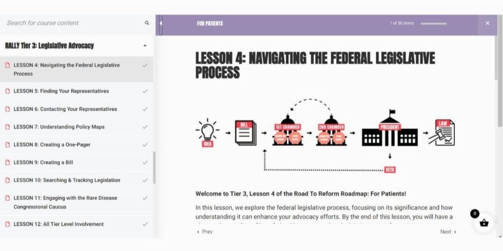 The “Rally” section encompasses Tier 3 and Tier 4, which delve into more advanced advocacy strategies. Tier 3 focuses on legislative advocacy, guiding you through the process of influencing policy and engaging with lawmakers to address issues related to chronic conditions and rare diseases. Tier 4 takes this further by preparing you for leadership roles, helping you spearhead systemic reforms and contribute to broader strategic initiatives.